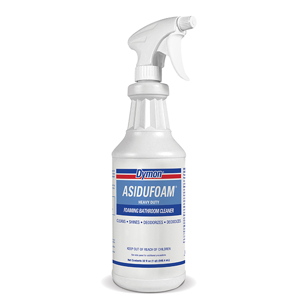 Dymon® ASIDUFOAM® Foaming Bathroom Cleaner removes dirt, soap scum and stains caused by mildew, mold or algae, oxidation, corrosion, urine salts, light rust, lime, calcium and iron deposits from bathroom surfaces including tile grout joints, porcelain, fiberglass, imitation marble, stainless steel, brass, rubber and copper.