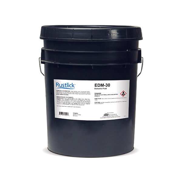 Rustlick™ EDM-30 is a quality EDM fluid/dielectric oil for Electric Discharge Machining. It has an allowable burn rate up to 150 amps and should be used only with paper cartridge filters.
