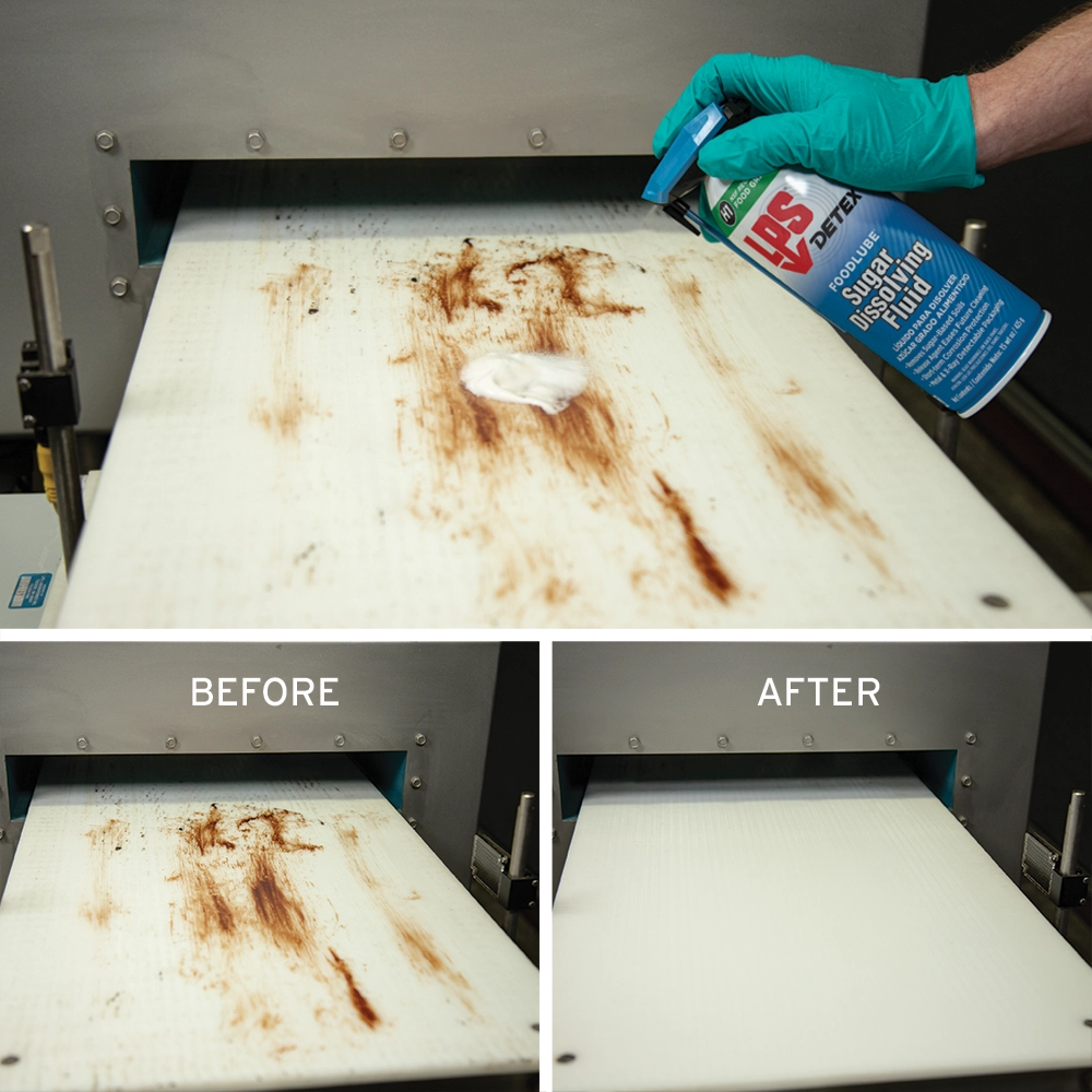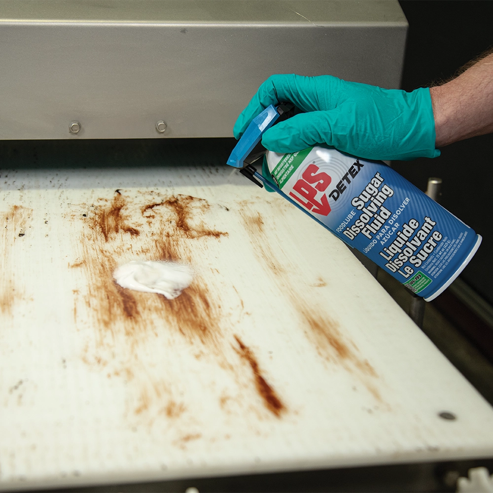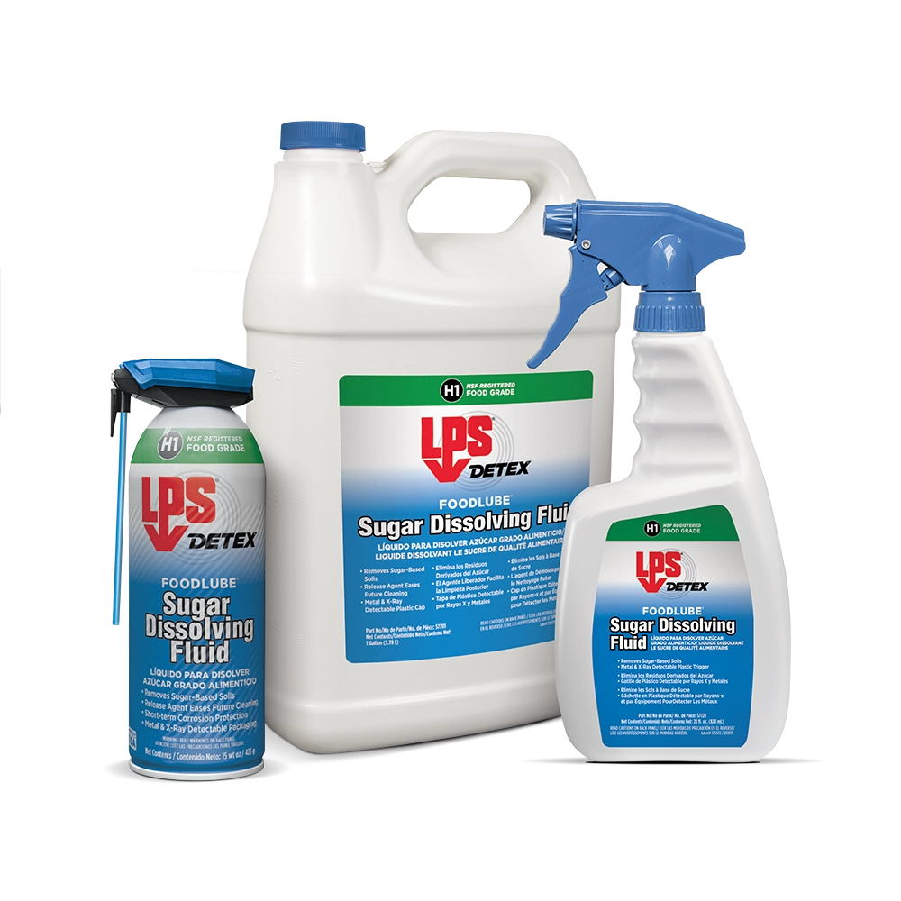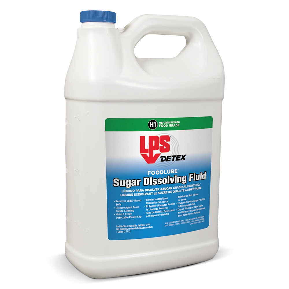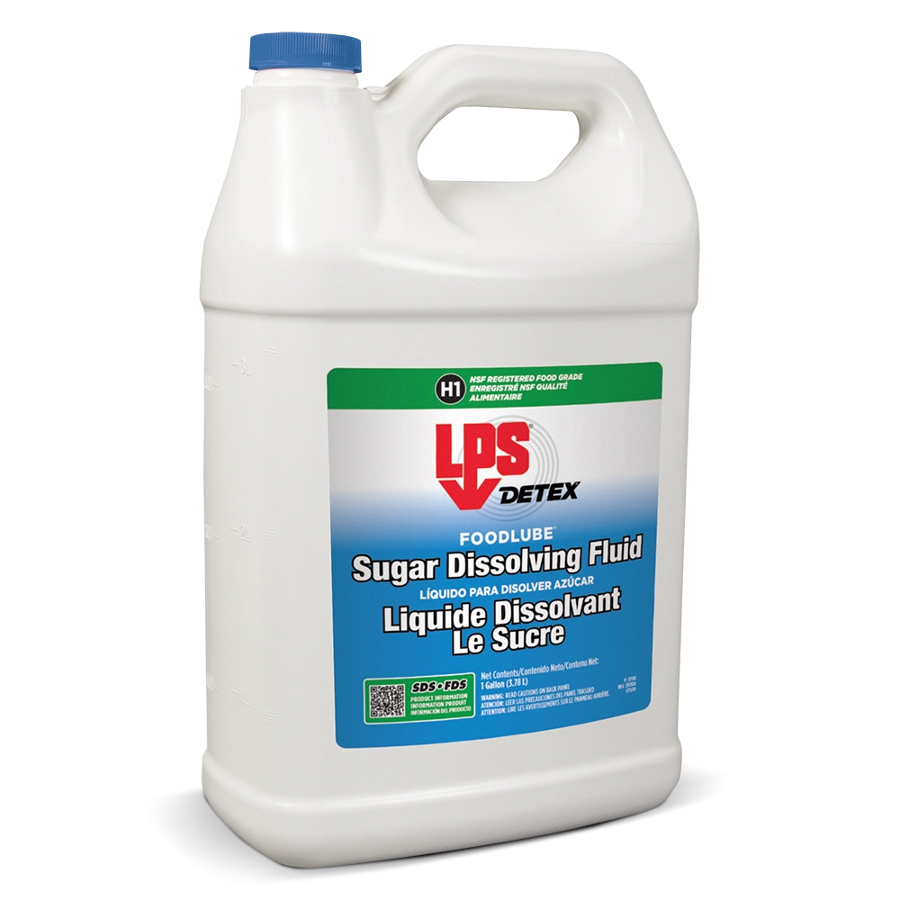 LPS® DETEX® FoodLube® Sugar Dissolving Fluid rapidly dissolves and removes sugar-based soils, keeping food and beverage equipment fully operational. This NSF H1 lubricant can be used anywhere within food processing facilities where incidental food contact may occur. The advanced formula leaves behind a thin lubricating film that eases future cleaning of sticky soils and provides short-term corrosion protection.