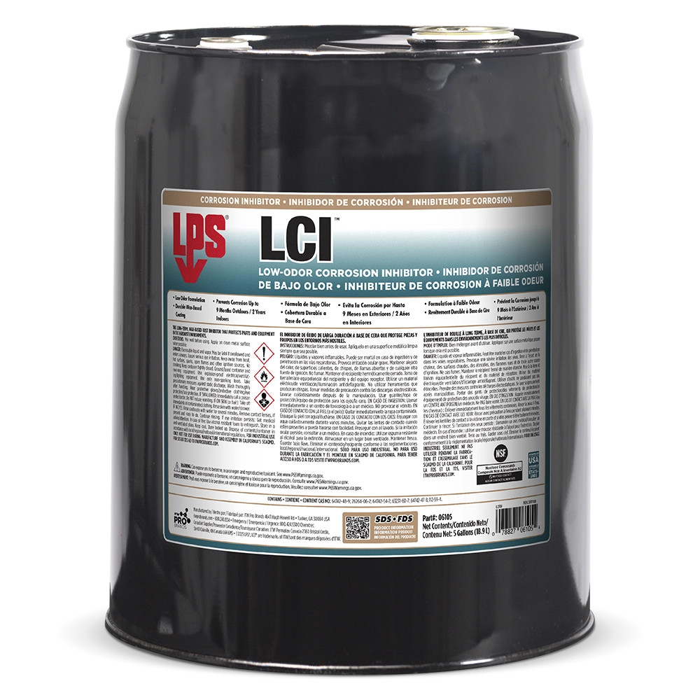 LCI Low-Odor Corrosion Inhibitor is a waxed-based low-odor corrosion inhibitor. It provides up to 9 months of outdoor protection, or 2 years of indoor protection of metal parts. It sets fast and resists dust and debris from adhering to treated surfaces.