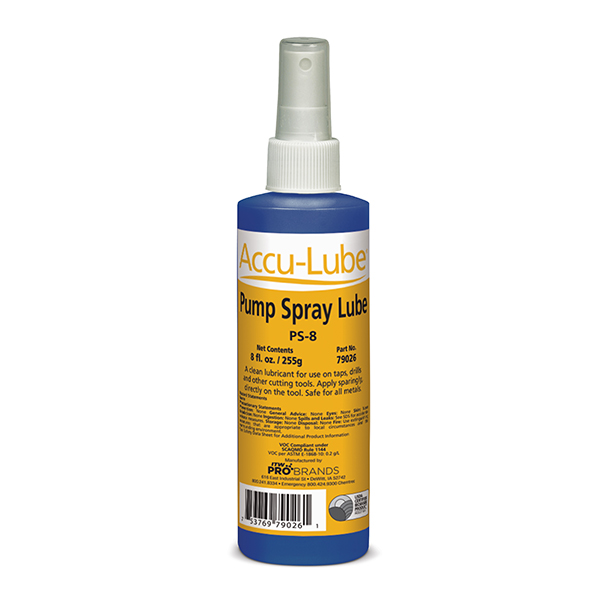 Safe, non-toxic, non-allergenic, and biodegradeable. Pump Spray Lube is ideal for short-run machining operations and for sawing, drilling, tapping, etc. operations in the shop and out in the field.